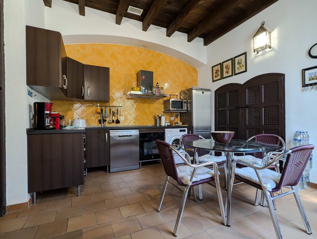 La cocina es independiente, totalmente amueblada y equipada, con zona de comedor, revestimientos cerámicos de estilo tradicional y ventanas al porche, además de acceso directo desde la zona de aparcamiento.