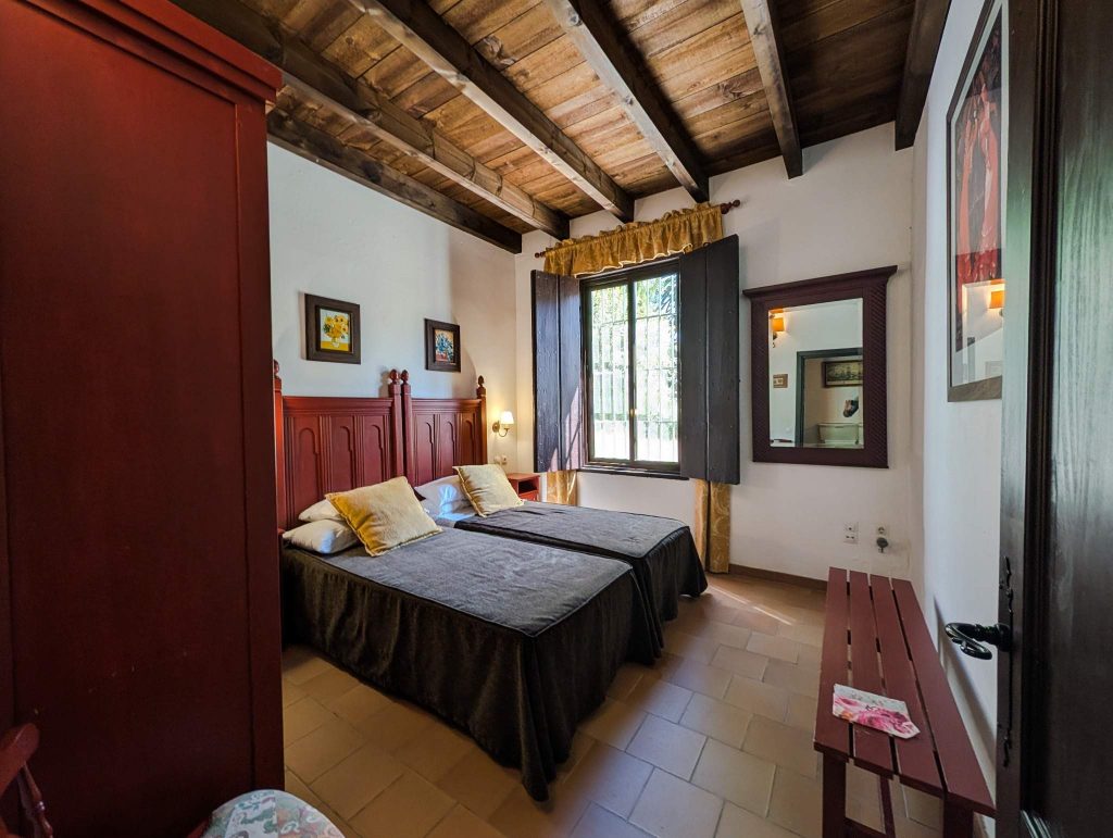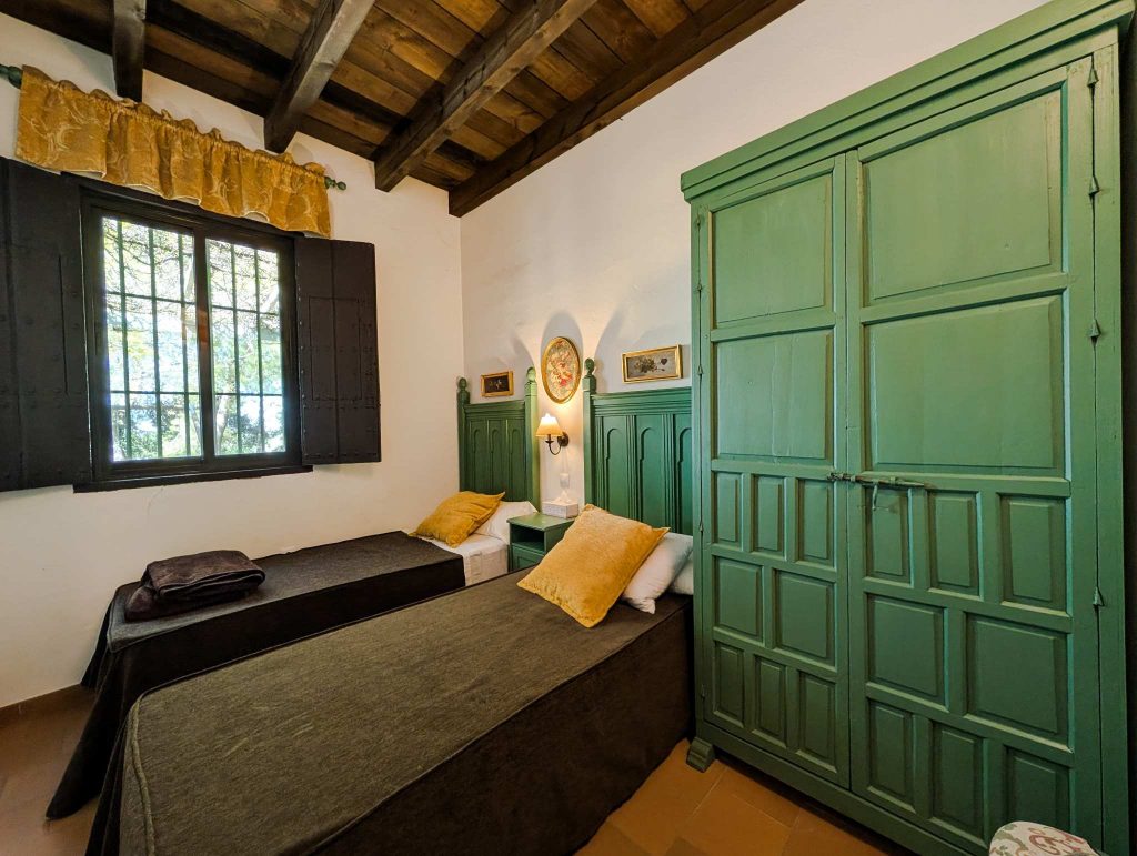 Las habitaciones disfrutan de luz natural gracias a sus ventanas al exterior, con carpintería de madera y rejas tradicionales, manteniendo la estética rústica de la vivienda.